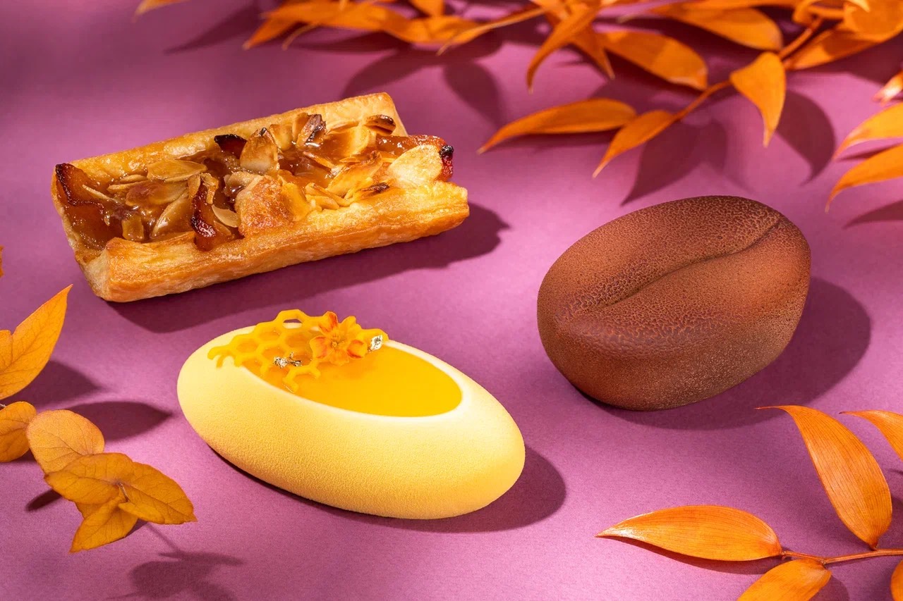Десерт «Кофе и лимон» – это яркое сочетание кофейного бисквита дакуаз и кофейного мусса, которое дополняют лимонный крем, кофейно-миндальное пралине и хрустящий фундук. «Мёд и имбирь» скрывает внутри имбирный бисквит и медово-имбирный ганаш с двумя видами конфитюра – из имбиря с шалфеем и мёда с имбирём.