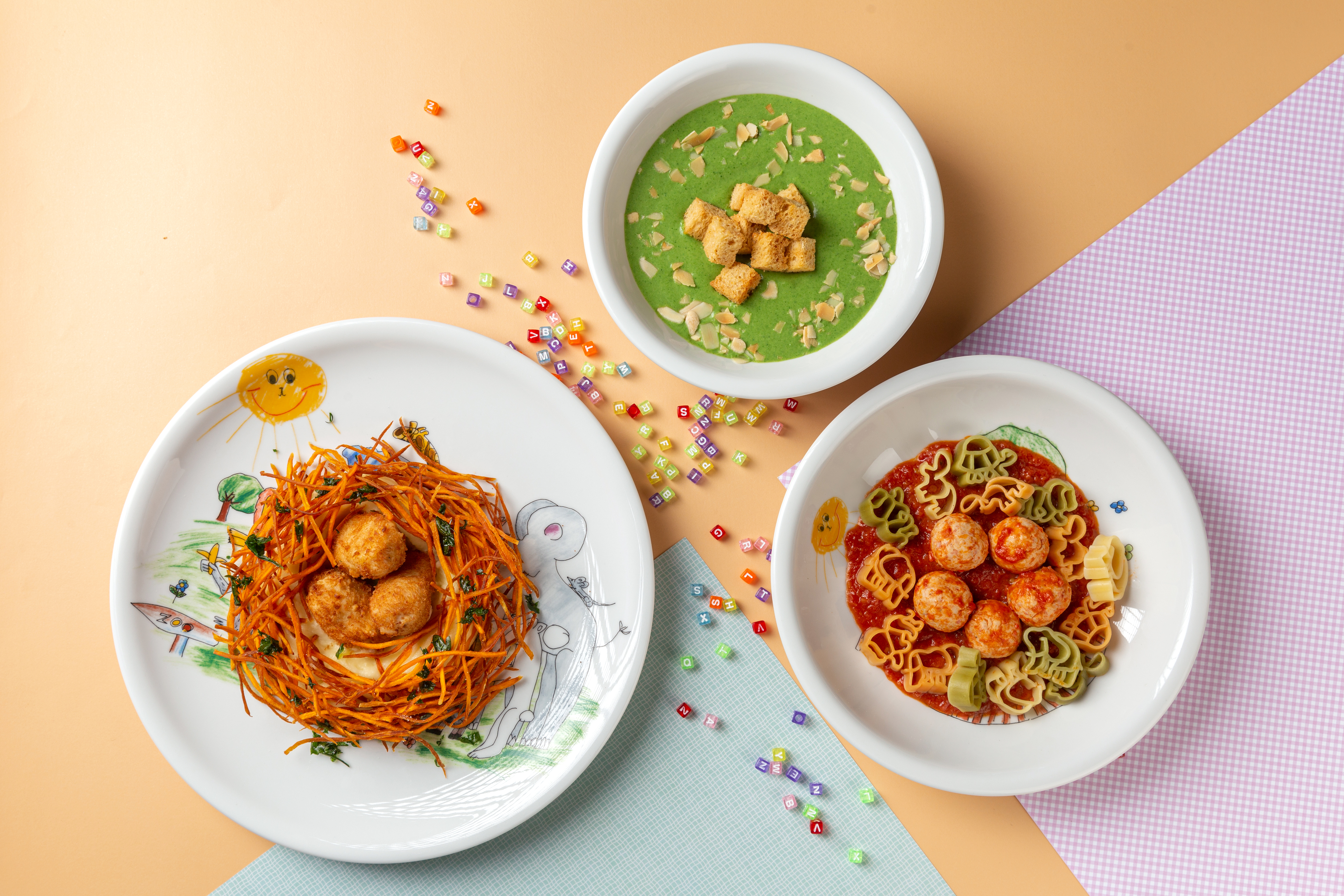 Главное место в меню отвели супам, представив сразу пять новинок. Суп из голландского картофеля готовится со сливками, в овощной крем-суп на курином бульоне добавляются гренки, а суп из овощей дополняется хрустящим киноа и бородинской крошкой. Полезные брокколи и шпинат шефы объединяют с миндальными перьями и сливочным сыром, чтобы дети не только доедали блюдо до самой последней ложки, но и просили добавки. И наконец, в рыбный суп с фрикадельками из лосося и трески добавляют пшёнку.