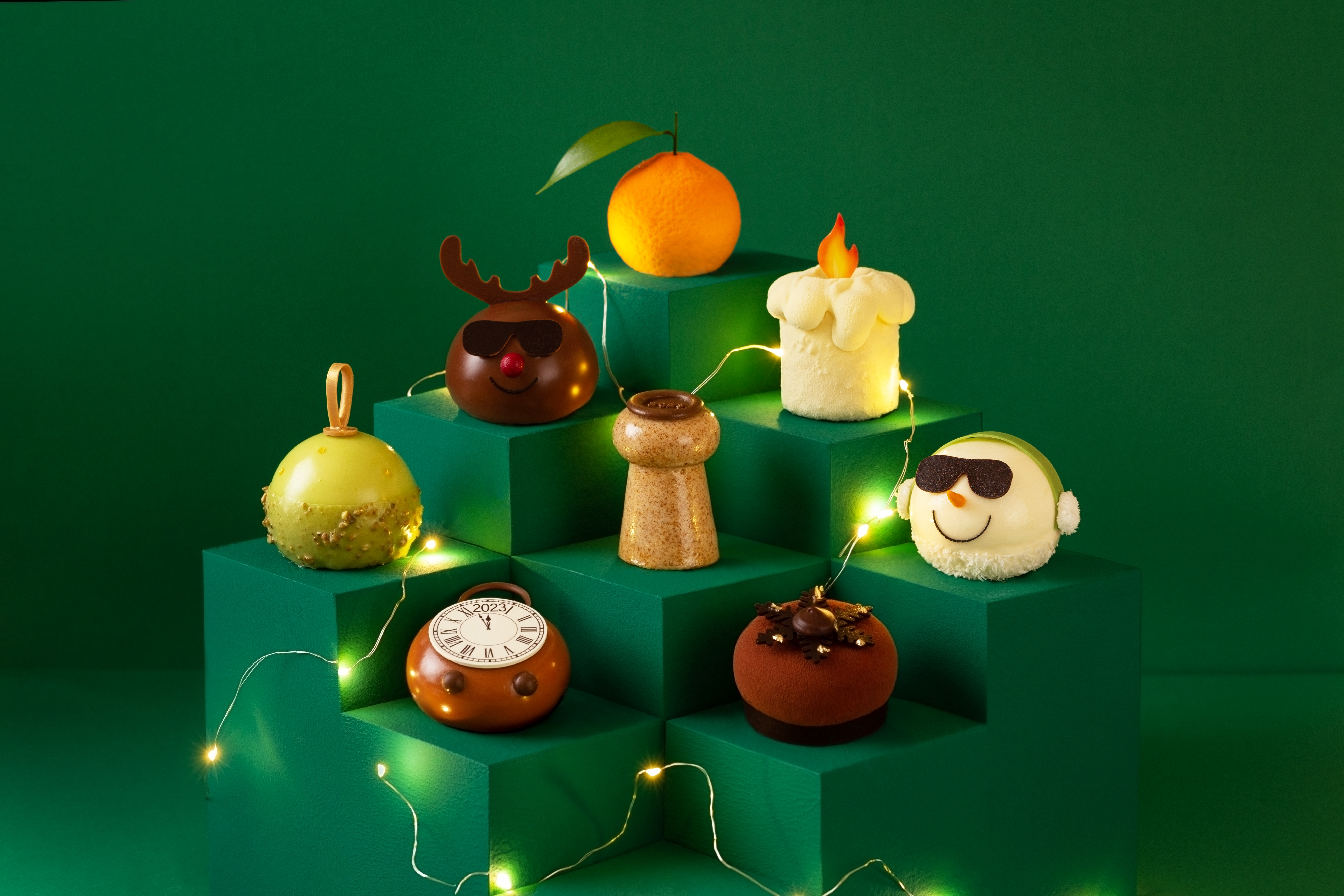 «Чин-чин» с сырным кремом, медовым бисквитом и солёной карамелью выполнен в форме пробки от шампанского, а «Люмьер» с нотками вишнёвого шнапса – в форме свечи. В виде десерта предстанет и самый новогодний фрукт – мандарин. Яркий вкус цитруса раскрывается в пирожном – от мусса до конфитюра, а дополняют его другие плоды с характерной кислинкой: лимон и юдзу.
