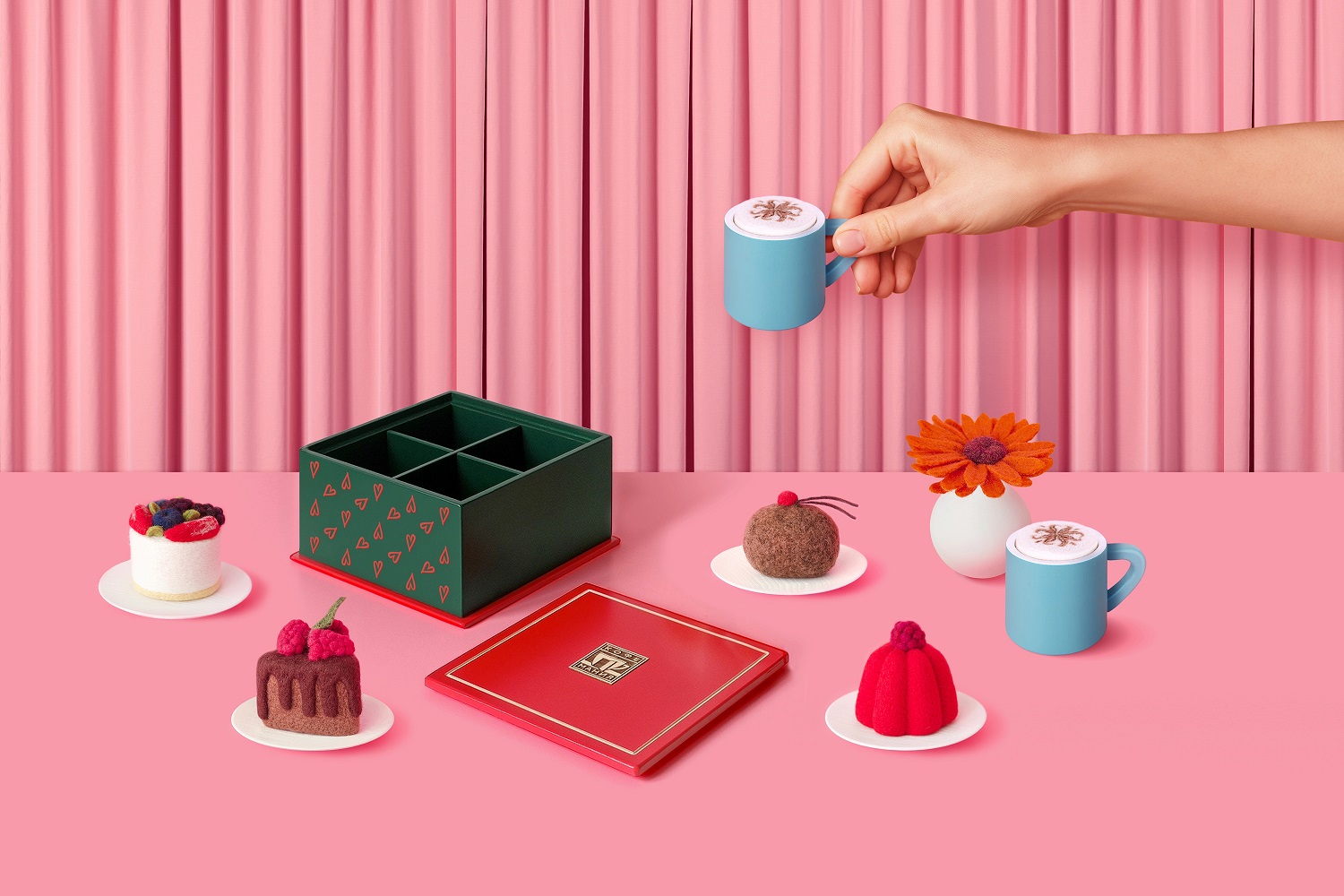 Игрушечные десерты из коллекции «Кофемании» (Дос Потатос, Любит-не-любит, Шато и Кето-чизкейк), кофейная пара со вставками для подачи раф кофе и точная копия десертной упаковки, выполненная из дерева и расписанная художниками, – коллекционный игровой сет создали вручную из главных хитов ресторана. Завершает набор миниатюрная копия знакомой многим декоративной вазочки с цветком герберы, которая украшает стол в каждой «Кофемании».