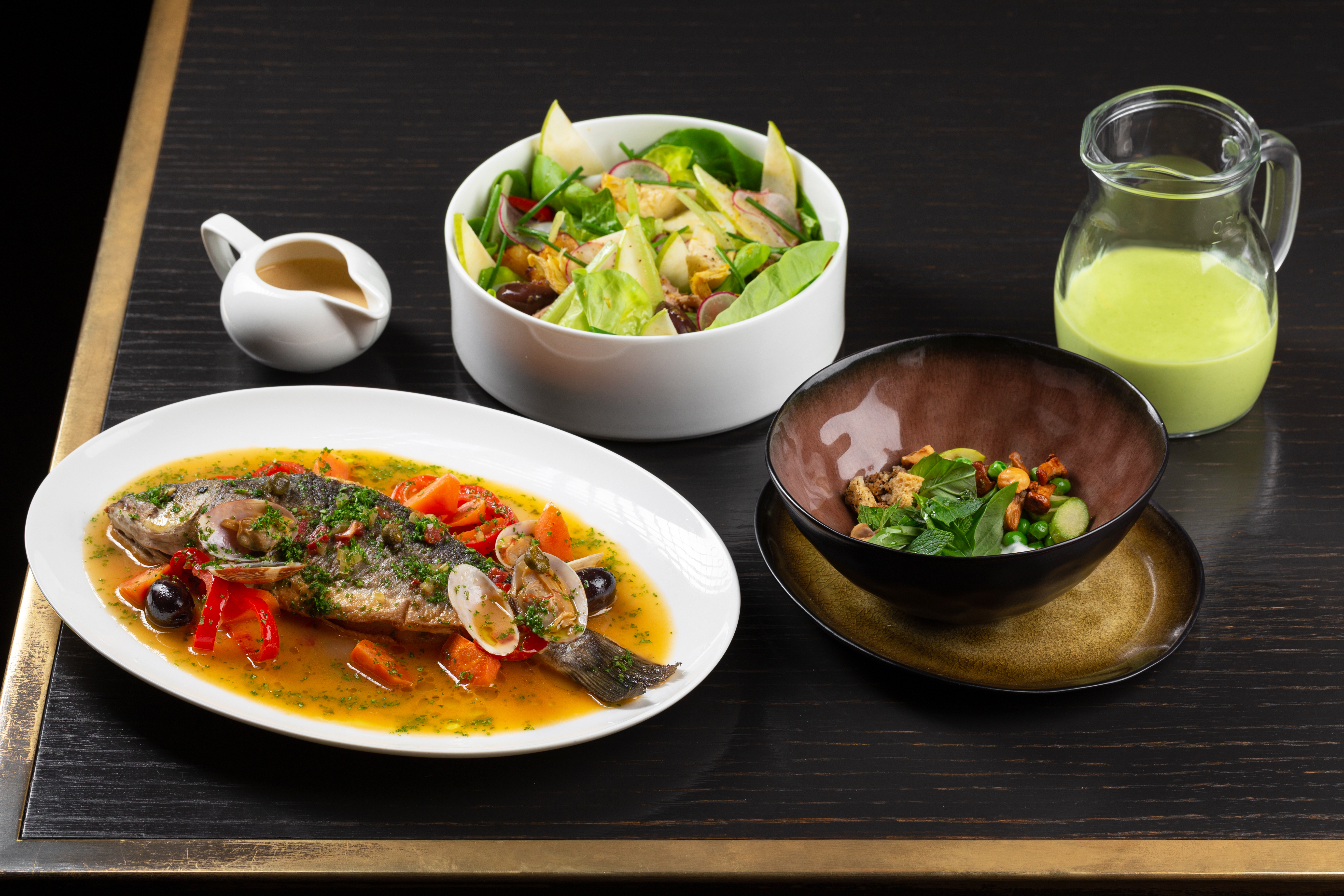 Стартует меню с «Большого бранча»: обжаренные до золотистого цвета картофель с тимьяном, цукини и томаты черри подают с яйцами по-шотландски, кальмарами и лангустинами с цыплёнком в соусе «Якитори».